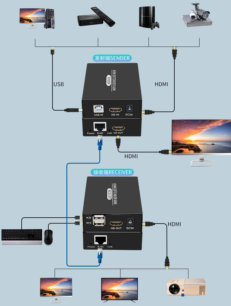 * 1 Unit HDMI KVM Sender dan 1 Unit HDMI KVM Receiver