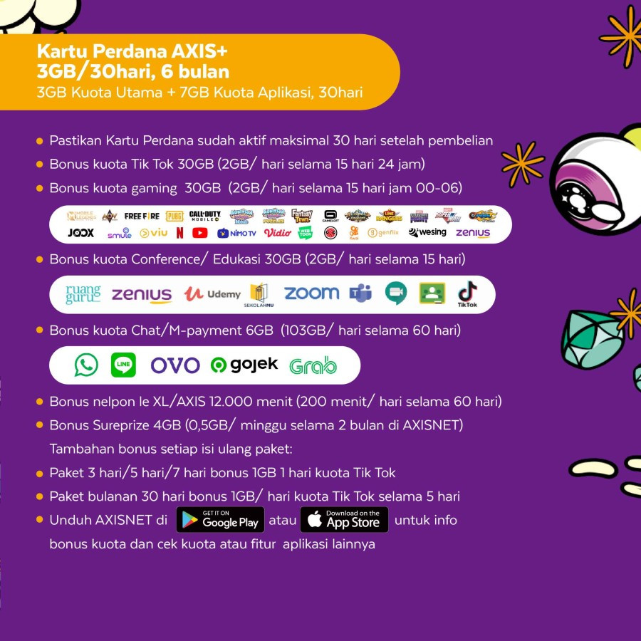 • Tambahan Kuota Game Unli. 1GB/hari (aktif selama kuota utama aktif) dan dapat diaktifkan melalui Axinet