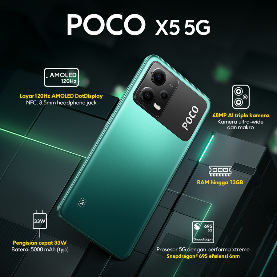 Dengan dukungan 5G, Anda dapat menikmati kecepatan internet yang lebih tinggi dan stabil. POCO X5 5G juga dilengkapi dengan fitur-fitur modern seperti sensor sidik jari, sensor cahaya, dan sensor jarak yang akan membuat pengalaman menggunakan smartphone ini semakin nyaman dan aman. Dengan kombinasi spesifikasi yang tangguh dan desain yang elegan, POCO X5 5G merupakan pilihan yang tepat bagi Anda yang menginginkan smartphone berkualitas tinggi dengan harga yang terjangkau.