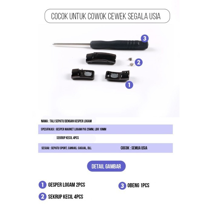 - terdapat : 2 pcs gesper logam, sekrup kecil 4pcs, obeng 1pcs, tali sepatu 2pcs